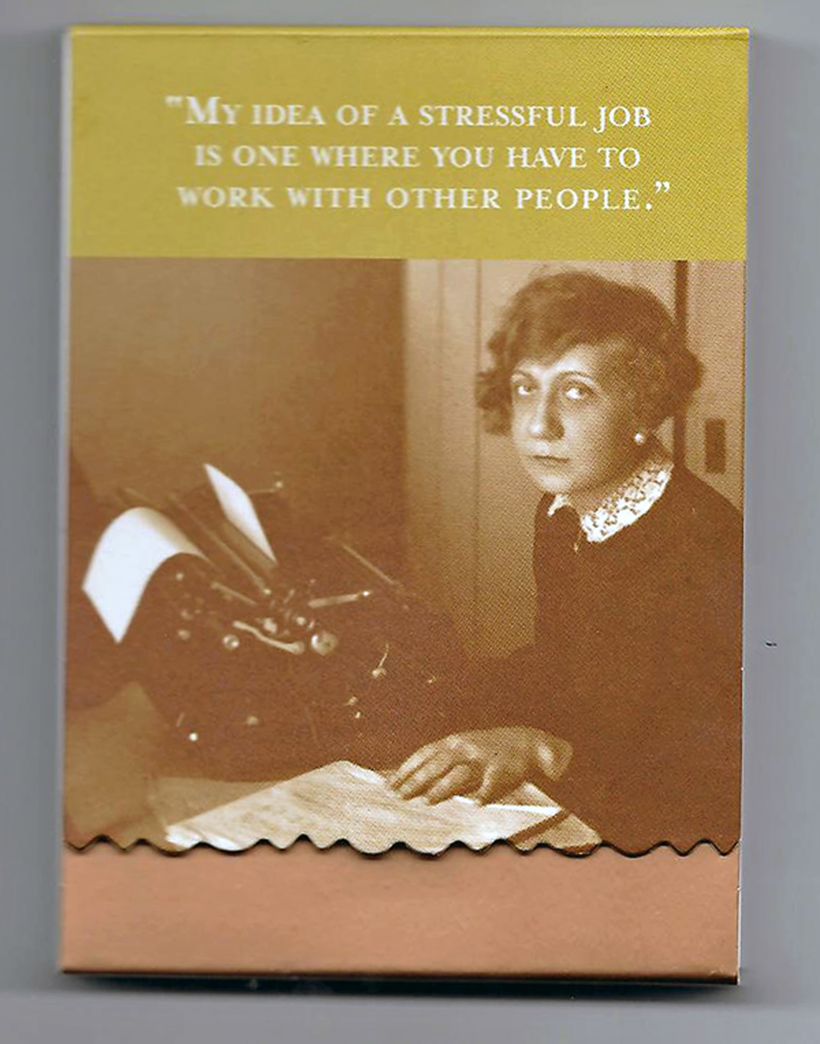 The first person to send me his/her regular mailing address will receive the fun, mini notebook pictured below. The saying at the top reads “My idea of a stressful job is one where you have to work with other people.” How writerly.