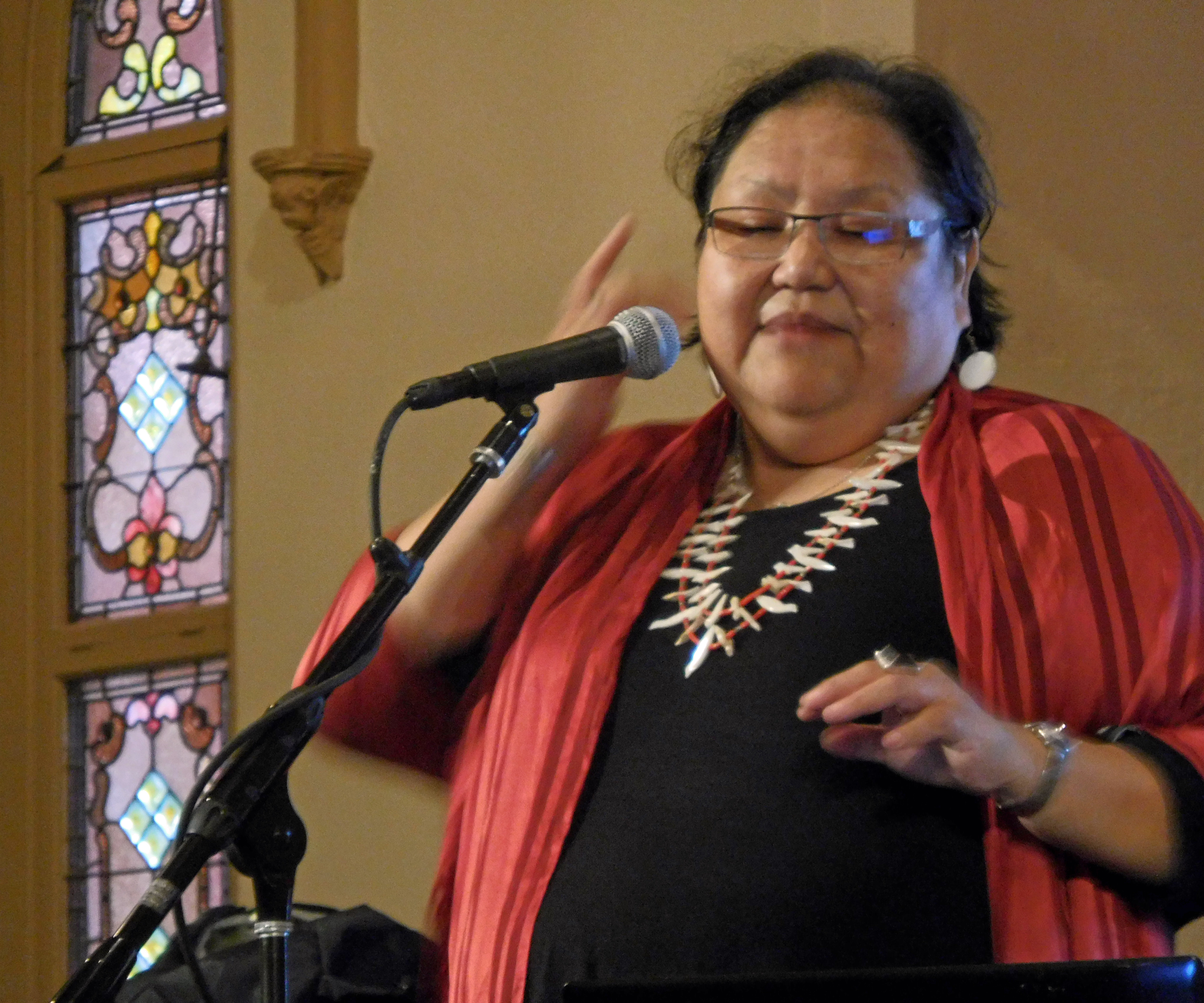 During the meeting, featured speaker Elizabeth Woody—a poet, visual artist and enrolled member of the Confederate Tribes of Warm Springs—entertained us with poems and stories, including one story about how Terry Gross, host of NPR’s “Fresh Air” invited Woody to submit a story to be read on the air. Woody did so only to have Gross reject the story and use one written by Sherman Alexie instead. A Spokane/Coeur d’Alene Indian who lives in Seattle, Alexie wrote a poetry collection Old Shirts and New Skins, which Woody illustrated.